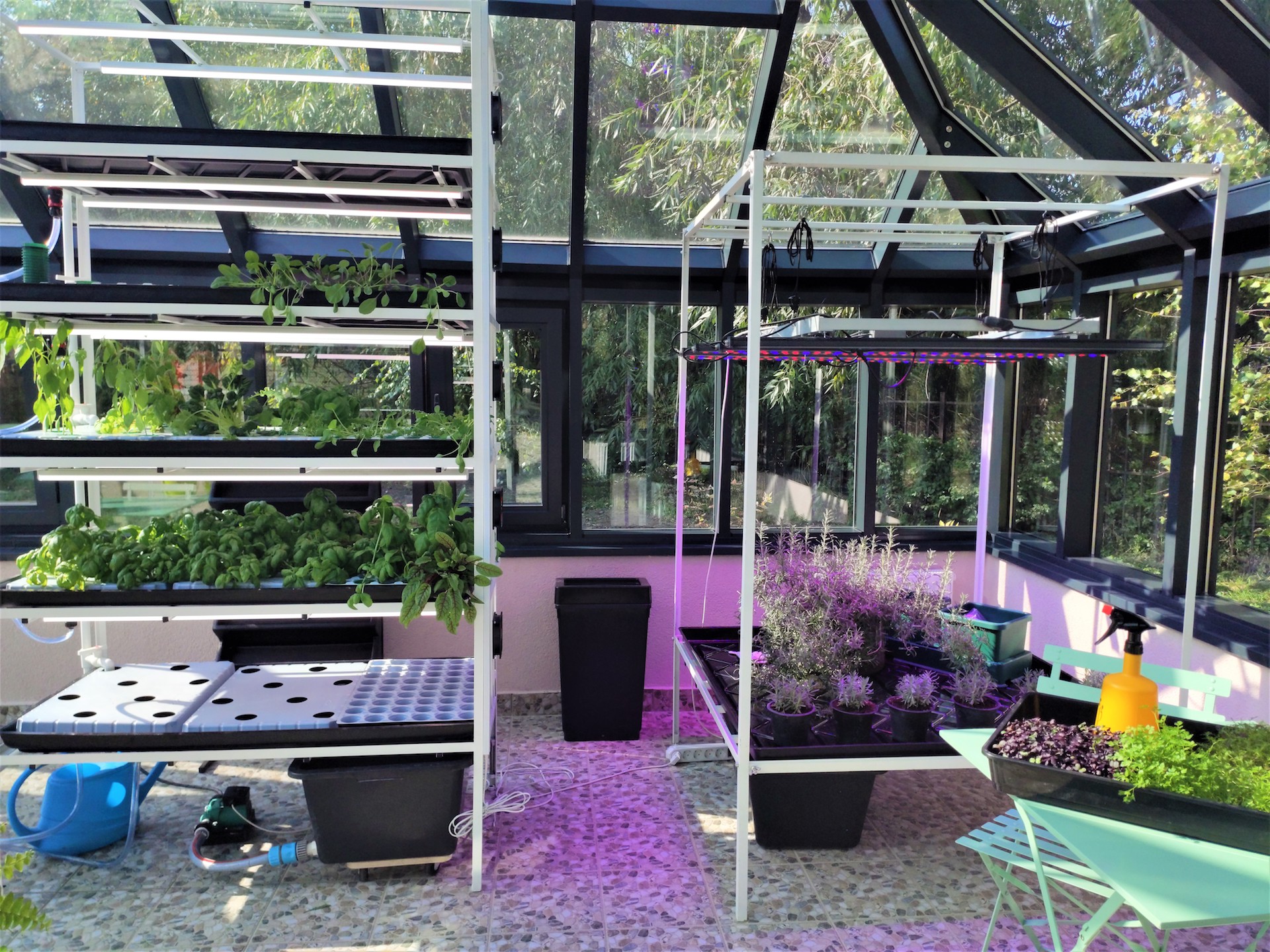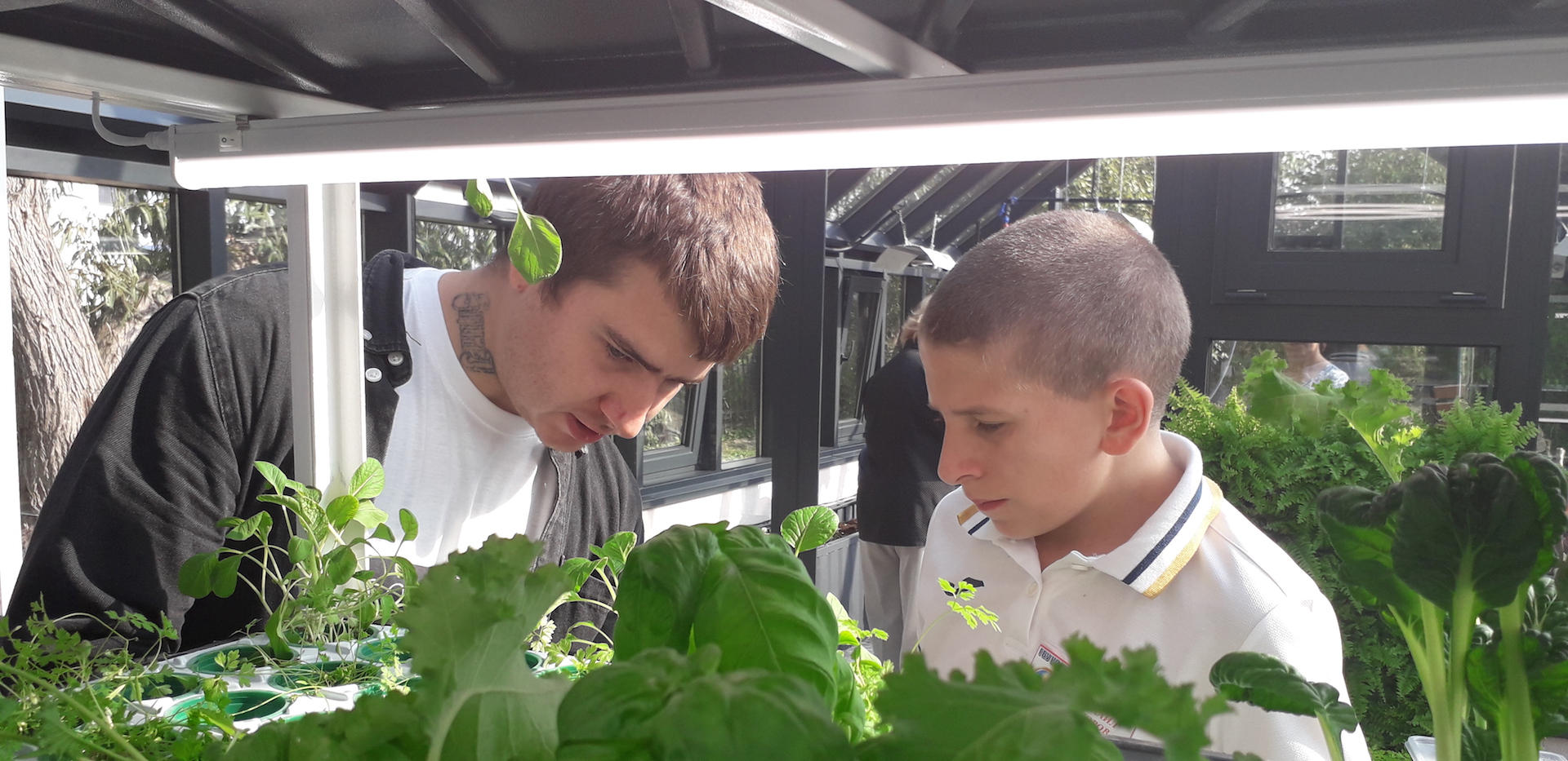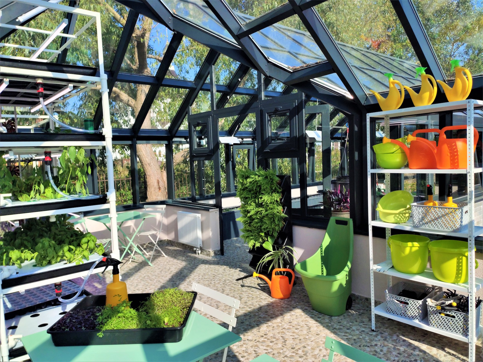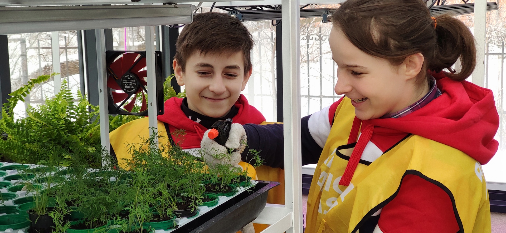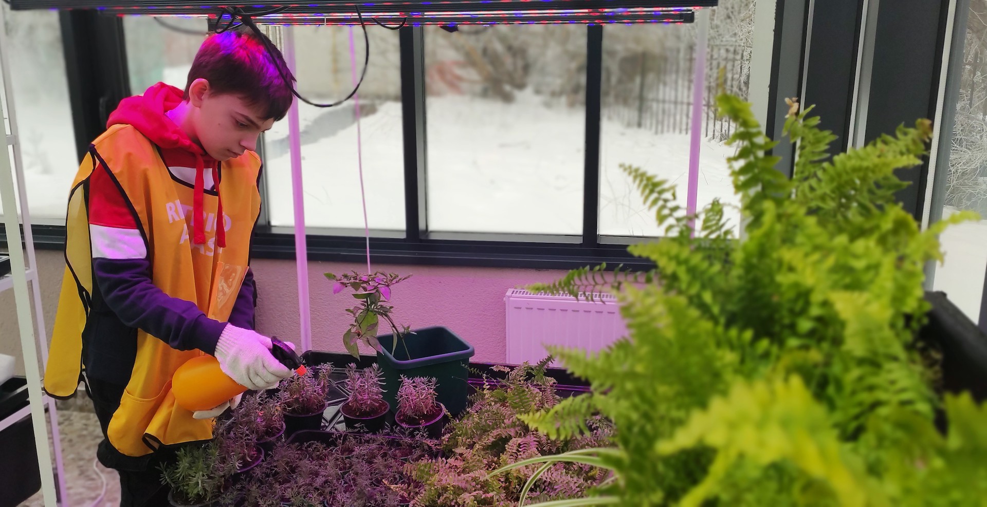 Лаборатория растениеводства и ландшафтного дизайна имеет открытые и закрытые (условия тепличного комплекса) зоны, в которых предусмотрено проведение теоретических и практических занятий. Лаборатория (теплица -мастерская) состоит из двух помещений: учебное помещение с системой гидропоники и помещение- оранжерея для практической работы, в котором размещены грядки с природным грунтом и специальным освещением светодиодными фитолампами. Теплица оборудована системами отопления, освещения, полива растений и имеет комплект оборудования для выращивания рассады, стол производственный со светодиодными фитолампами верхнего света, стеллаж-гидропонной установки для выращивания микрозелени /зелени/ягод (5 ярусов), модуль для зелени/ягод, грядки с природным грунтом, светодиодные фитолампа верхнего света в количестве 6 штук. В теплице предусмотрено оборудование для вертикального и горизонтального озеленения.